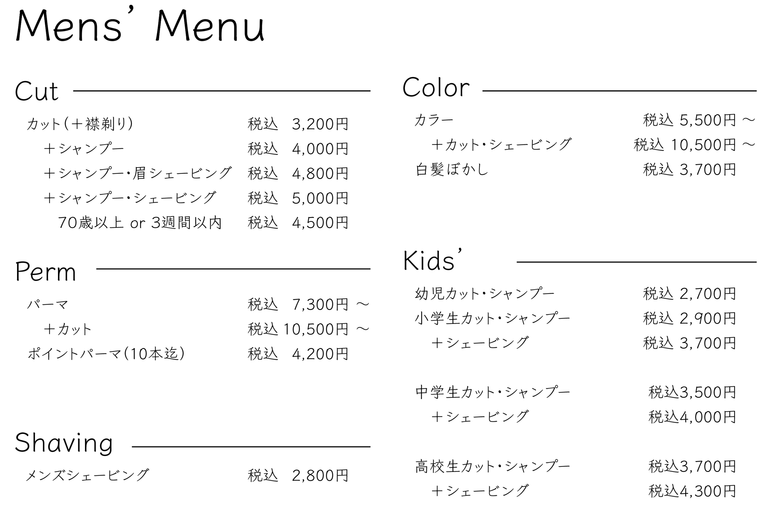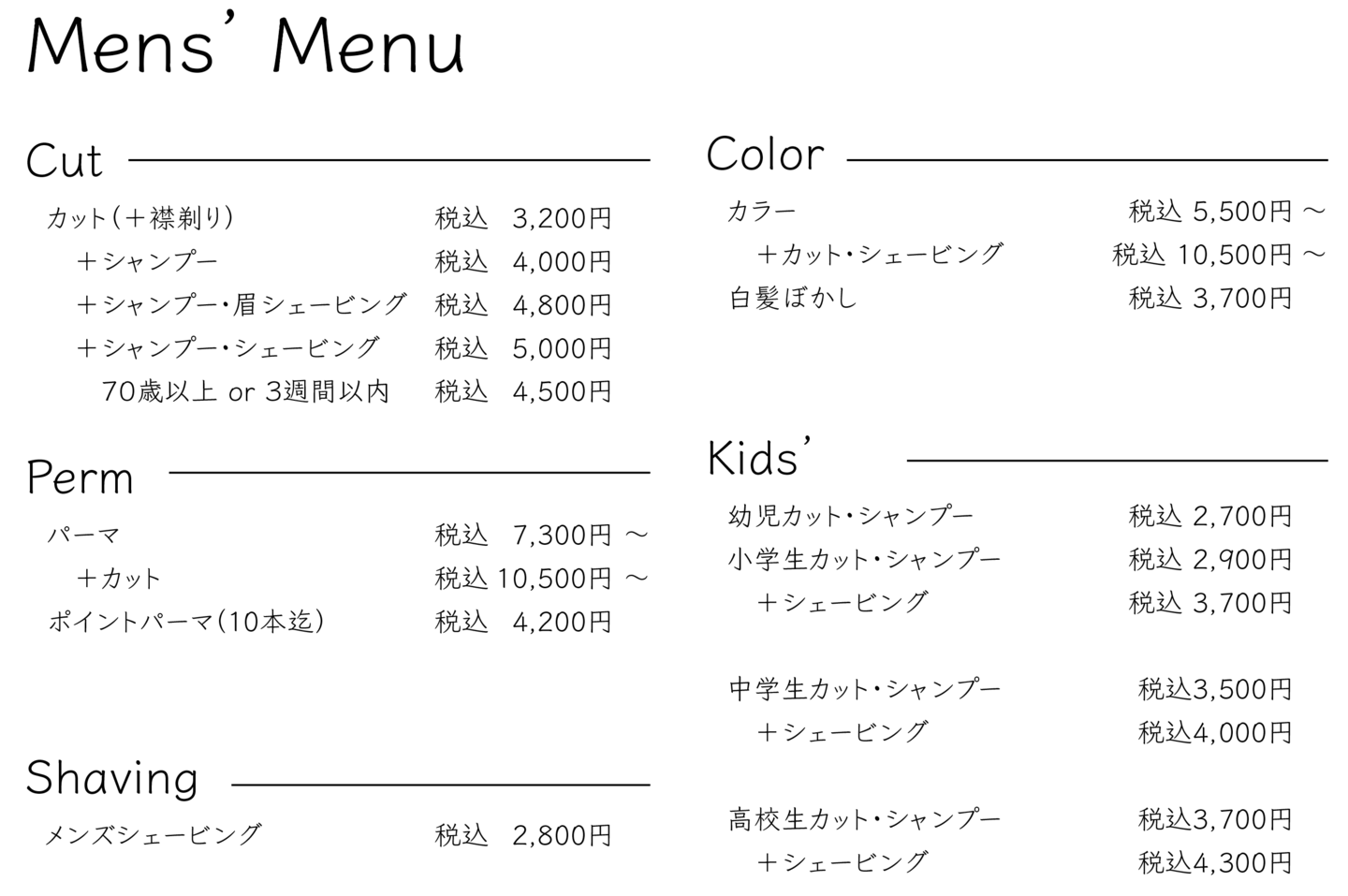 小学生男子カット・シャンプー・シェービング:3,700円