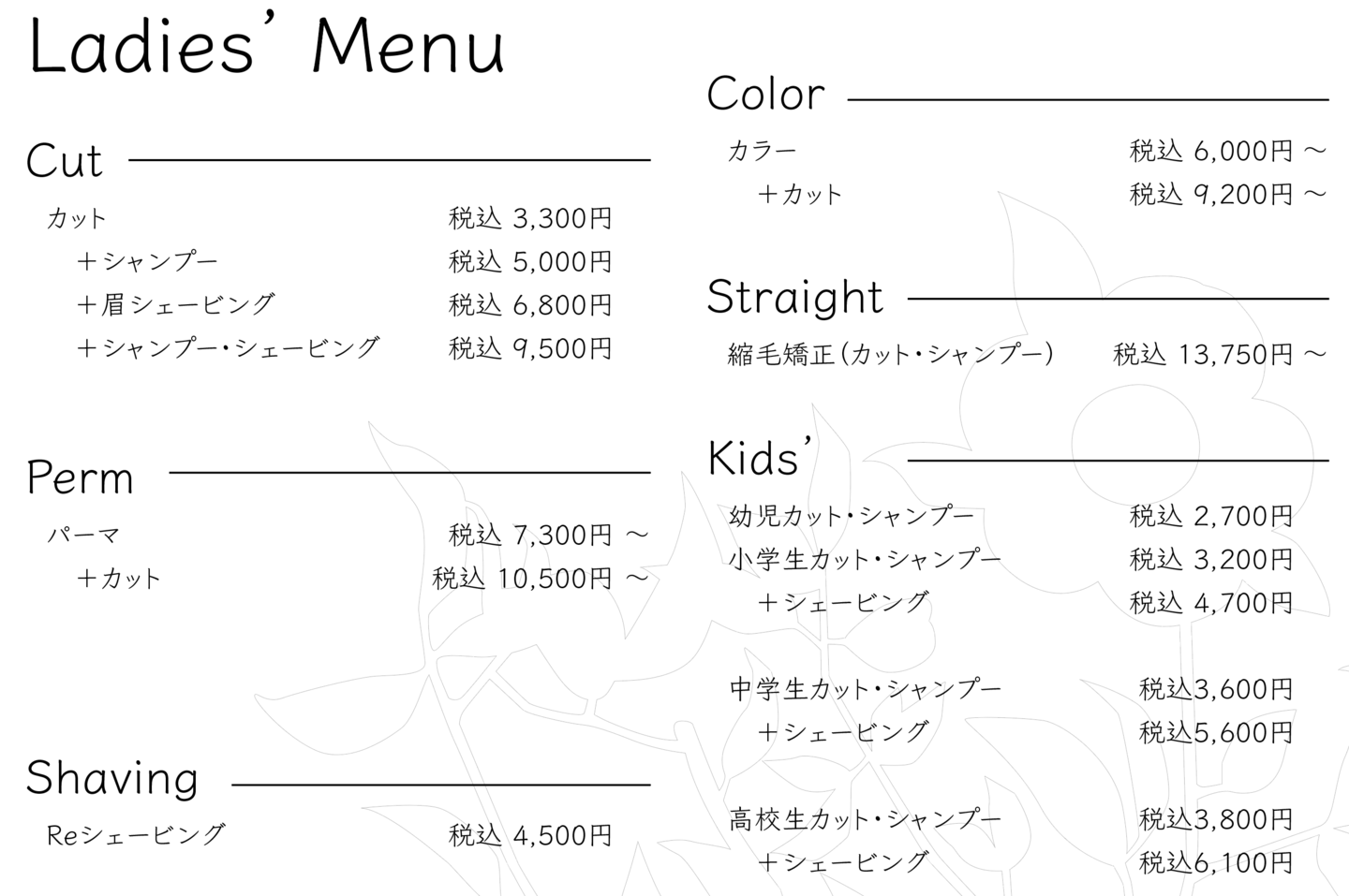 女性カット・シャンプー・シェービング:税込9,500円