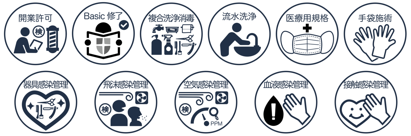 当店はHIVや肝炎ウイルスなどの感染症衛生管理対策として理容における「法定消毒遵守」に加え第三者検査機関により実証された効果をもつ「高水準複合洗浄消毒システム」を採用しております。どうぞ、安心してご来店ください。