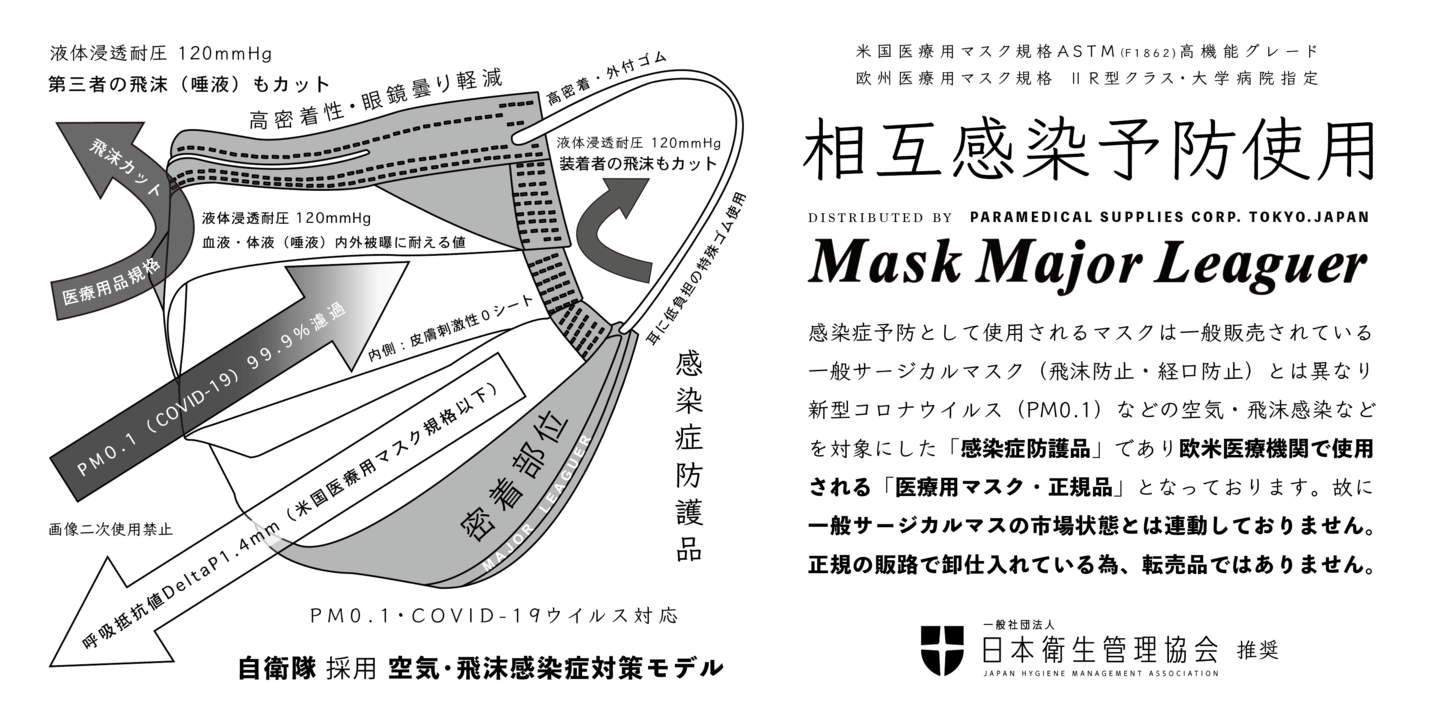 米国やEUでは医療用マスクにおいて血液等の体液や薬液等の浸透を遅延する性能(液体浸耐圧80mmHg以上)が最低基準として求められ、メジャーリーガーは最上級数値の120mmHgをクリアしております。