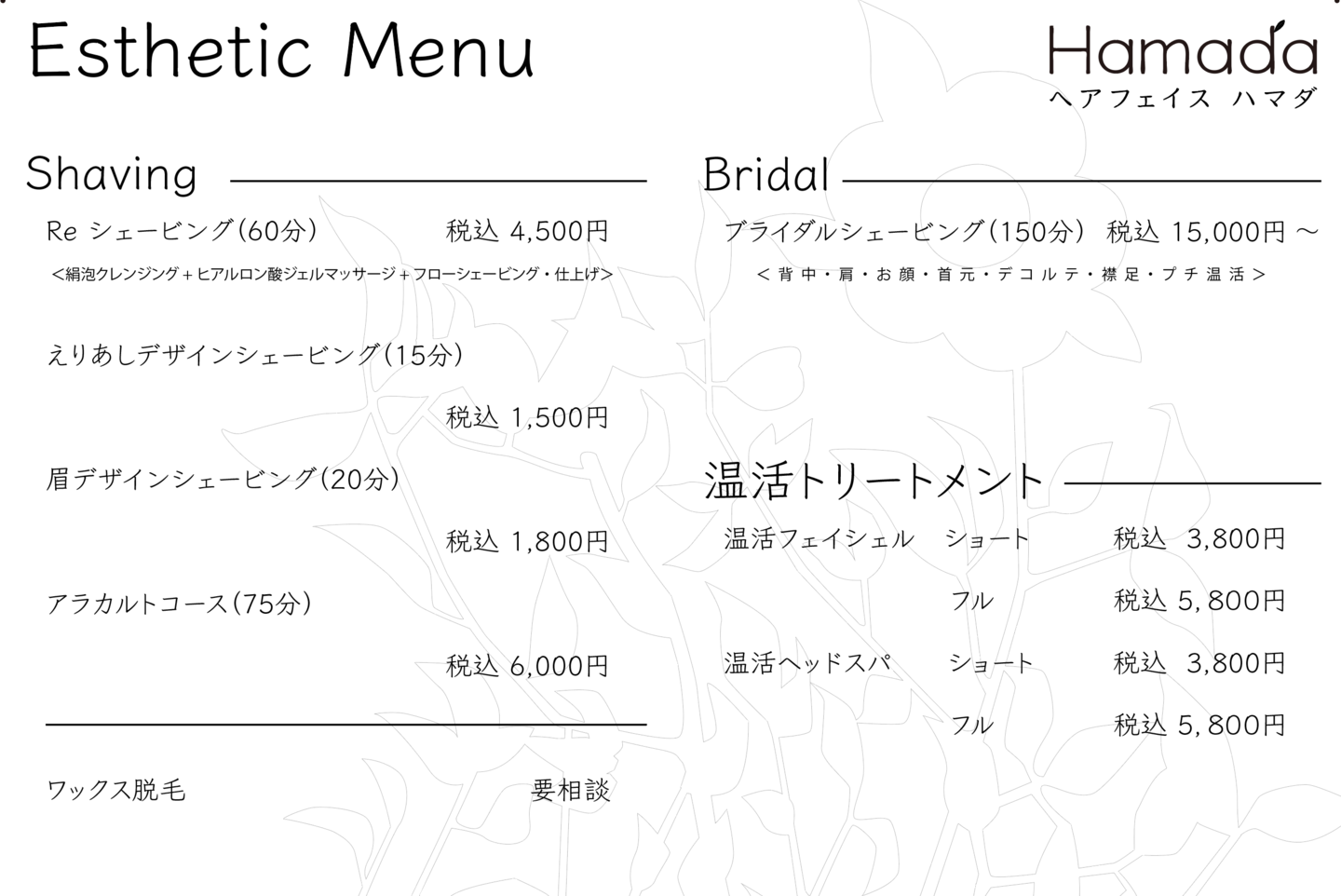 お顔そり・エステメニュー